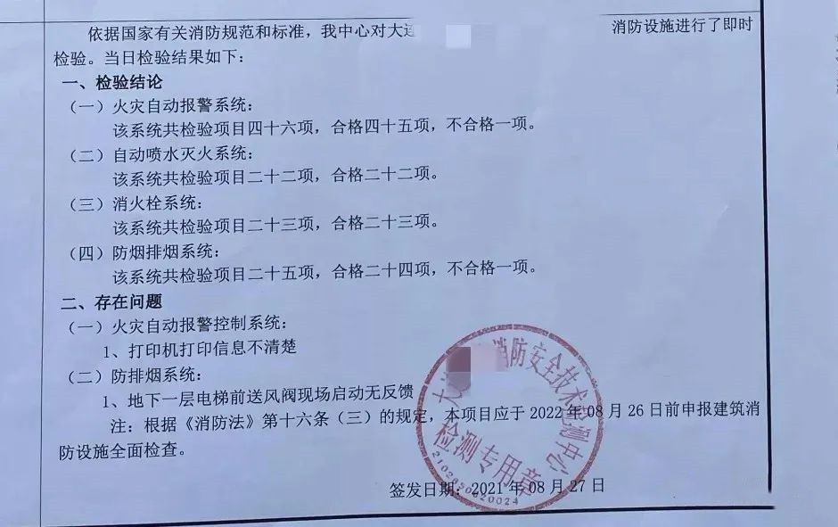 经消防执法人员调查了解,该大厦消防安全管理人王某伙同刘某(某消防维保单位负责人),伪造检测报告,掩盖其未按规定进行定期消防设施检测的违法事实。中山区消防救援大队将相关违法线索移交属地公安机关。