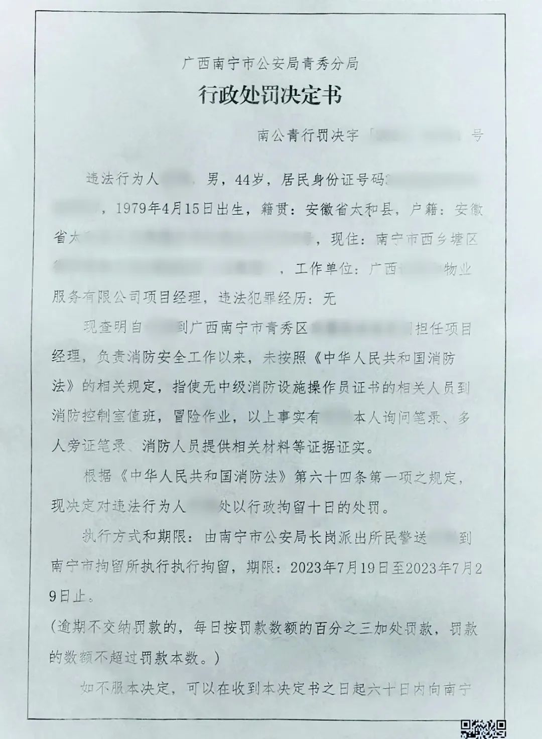 根据《中华人民共和国消防法》第六十四条第(一)项的规定,南宁市公安局青秀分局对物业主要负责人处以行政拘留10日的处罚。