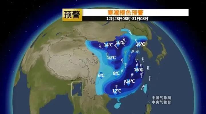 中央气象台升级发布寒潮橙色预警:28日至31日,中国中东部大部地区将开启“速冻”模式,迎来一次寒潮天气过程。这也是自2016年11月以来,中央气象台再次发布最高级别的寒潮预警。